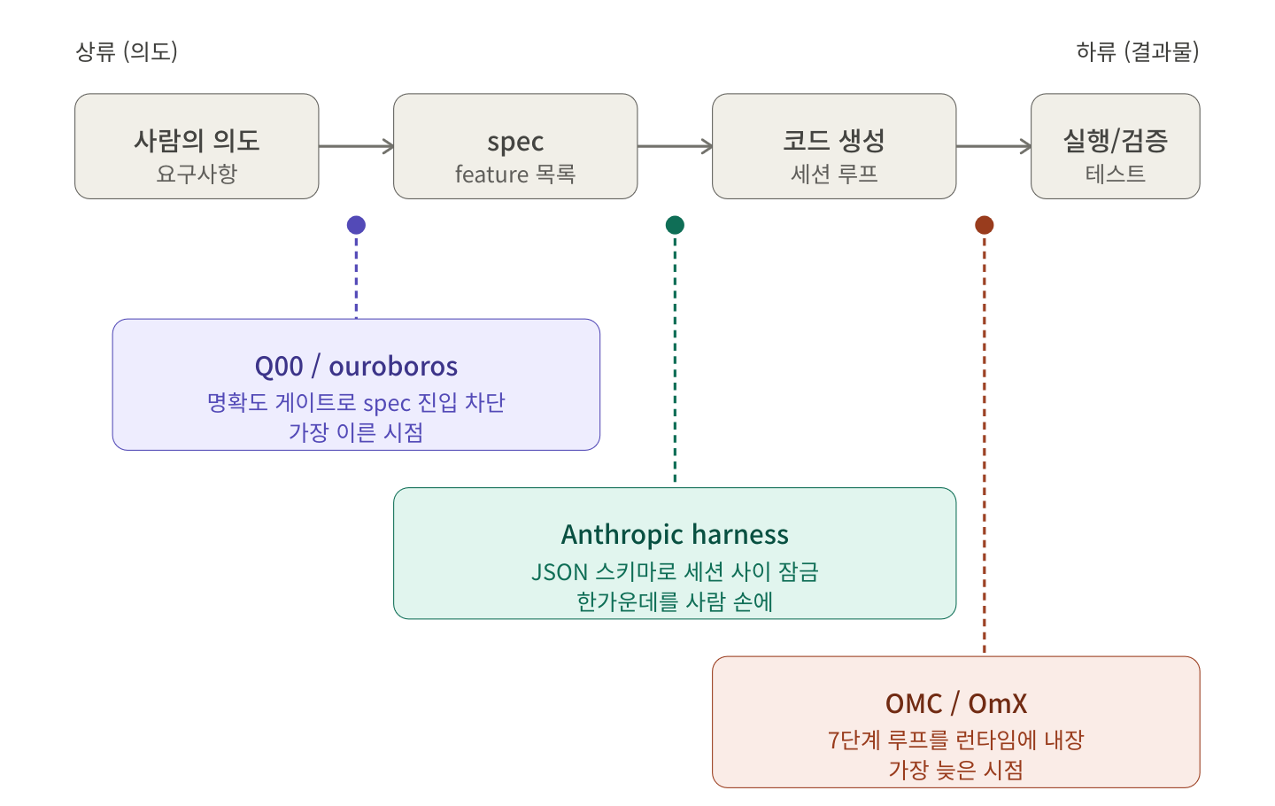 지금까지 사람의 의식(상류)부터 결과물(하류)까지의 흐름에서 서로 다른 시점에 개입하는 도구들을 살펴보았다. 여기까지 살펴보고 나니 원문의 harness가 개입하는 시점이 다르게 읽힌다. 어느 시점에 손을 대느냐의 양 끝 — Q00과 OMC — 사이에서, 원문은 한가운데서 사람의 손에 남겨두는 쪽을 골랐다. 처음엔 이게 가장 소극적인 위치로 보였지만, 지금은 spec과 런타임 양쪽 어떤 것도 미리 깨지 않는, 가장 늦게까지 잠그지 않아도 되는 자리로 읽힌다.