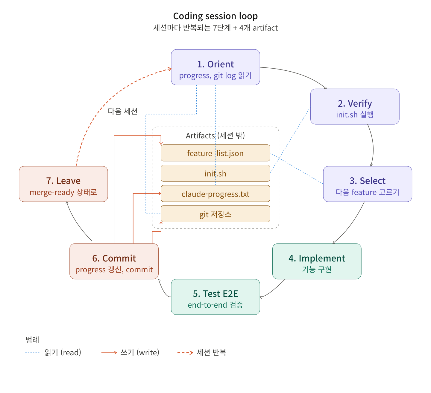 7단계 workflow. 세션의 전체 흐름을 정리하면 대략 7단계가 된다. 이 7단계 명명은 원문에 그대로 등장하는 것이 아니라 내가 글을 위해 묶은 것임을 미리 밝혀둔다. — Orient(progress와 git log 읽기) → Verify(init.sh로 환경 점검) → Select(다음 feature 고르기) → Implement → Test end-to-end → Commit/Document → Leave merge-ready.